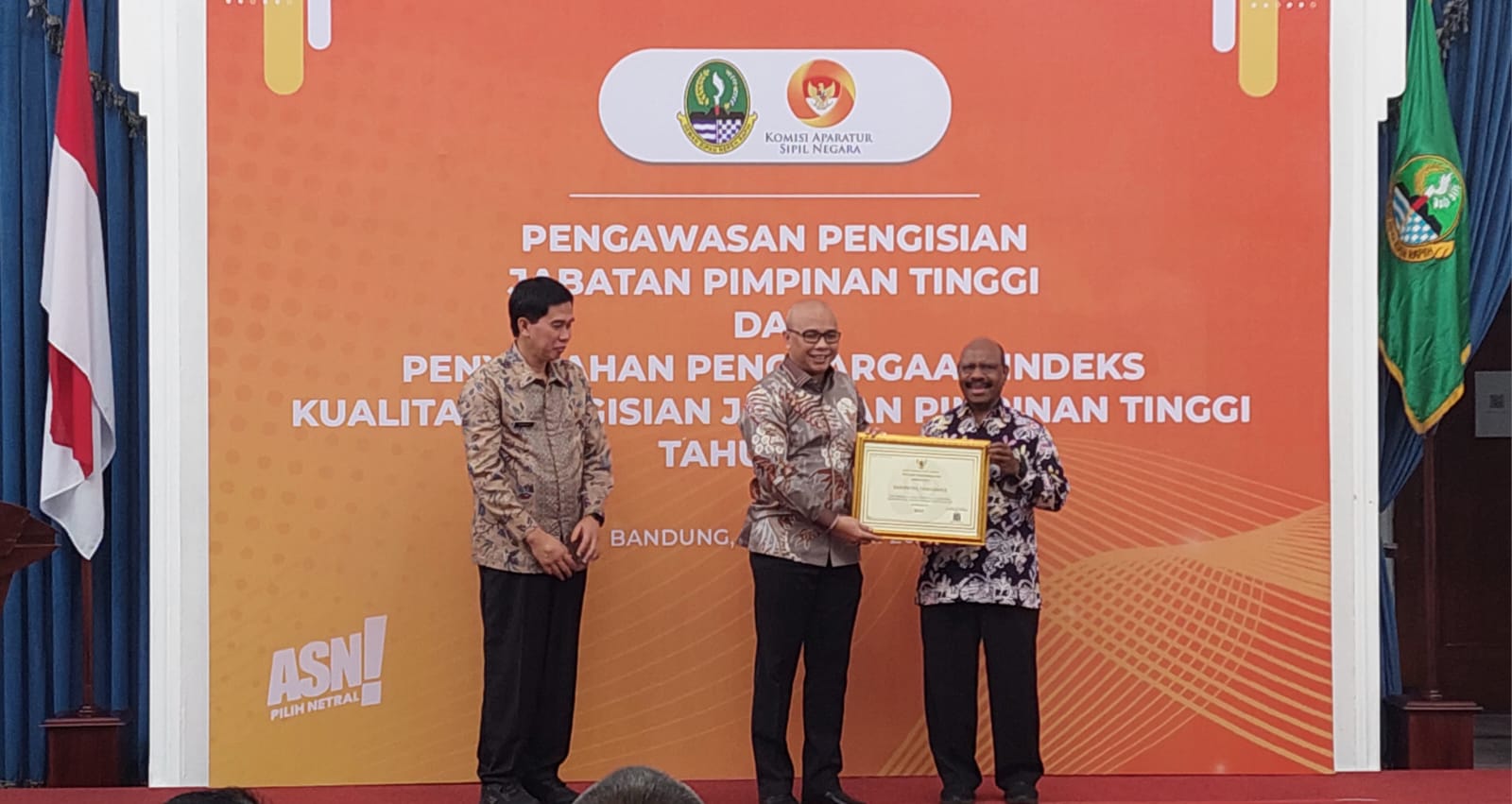 Wartapublik.net, Bandung – Sekda Kabupaten Tanggamus Drs. Hamid Heriansyah Lubis, M.Si Menerima Penghargaan Sistem Merit 2023 Dalam Pengisian Jabatan Pimpinan Tinggi (JPT) dari Komisi Aparatur Sipil Negara (KASN) yang diserahkan oleh Komisioner Pokja Pengawasan Pengisian JPT Wilayah II, Prof. Agustinus Fatem di Gedung Sate, Bandung, Jum’at (16/02/ 2024).