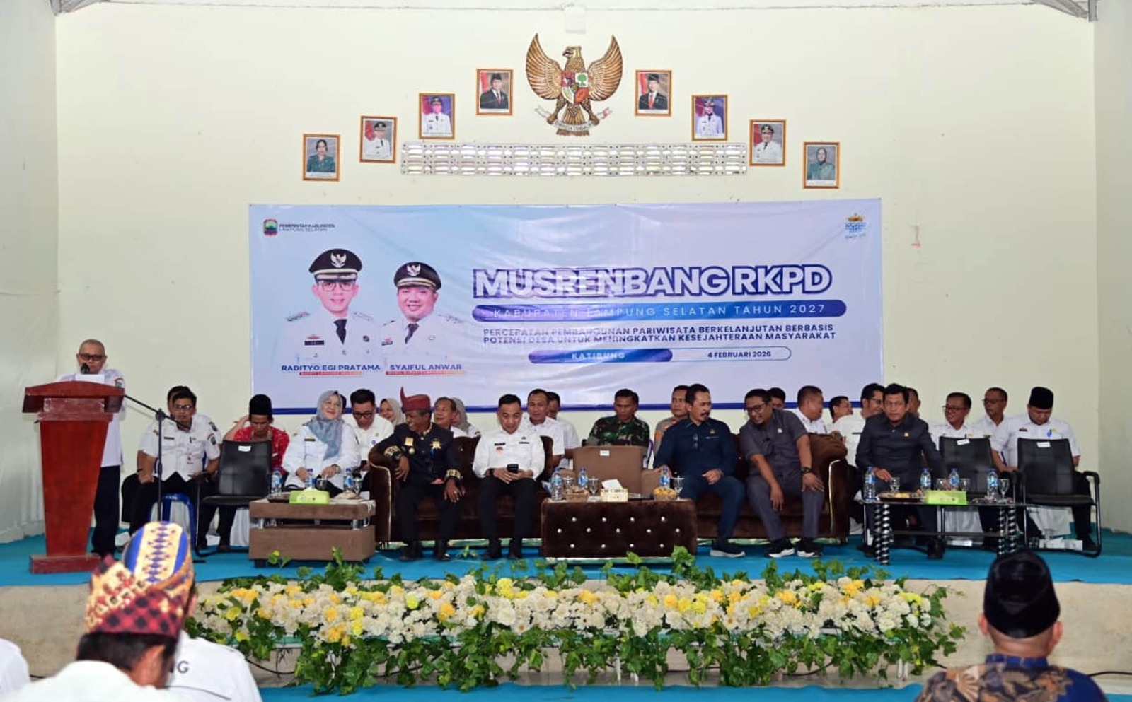 Arah pembangunan tersebut ditegaskan Bupati Lampung Selatan, Radityo Egi Pratama, saat Musyawarah Perencanaan Pembangunan (Musrenbang) RKPD Tahun 2027 yang digelar di GSG Bakhong Gawi, Desa Tanjung Ratu, Kecamatan Katibung, Rabu (4/2/2026).